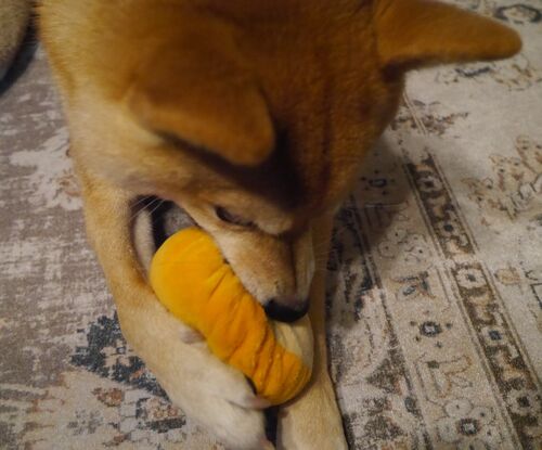 しばらく見向きもしなかったおもちゃなのに、急に「今日はこれ!」って感じで遊びだすたら王子。この日はケチャップの気分だったみたいだね。いきなりおもちゃ入れからガーっと咥えて・・ 昨日まではまるで気にしてなかったのにね。面白いね。このケチャップ…